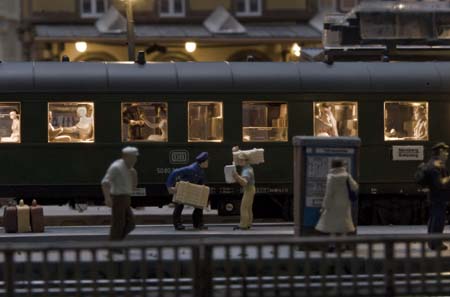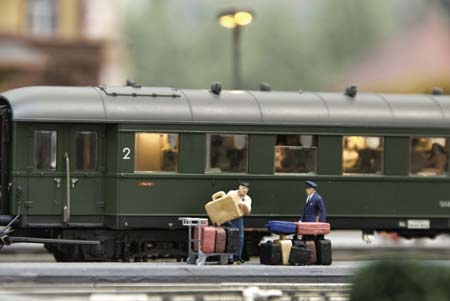 Die ersten Waggons werden beleuchtet und mit Reisenden bestückt