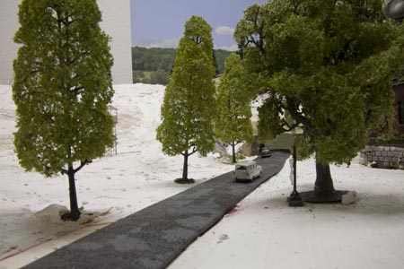 Die Straße mit Straßenbelag - aber die Bäume sind echt zu groß