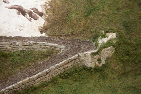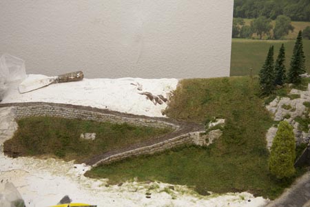 Eine Detailaufnahme. Die Mauer und der Straßenrand sind fertig