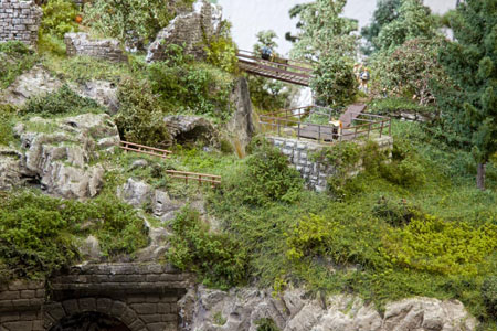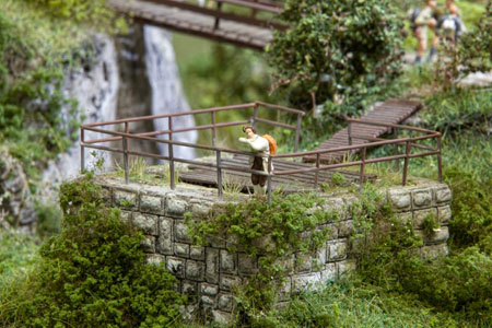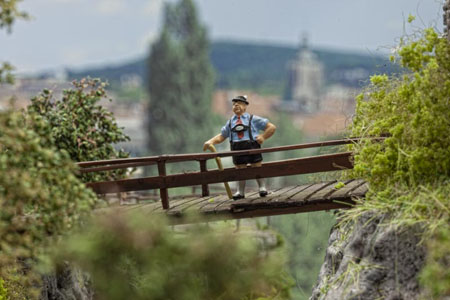 Ein Wanderer auf der selbstgebauten Holzbrücke über den Burggraben...